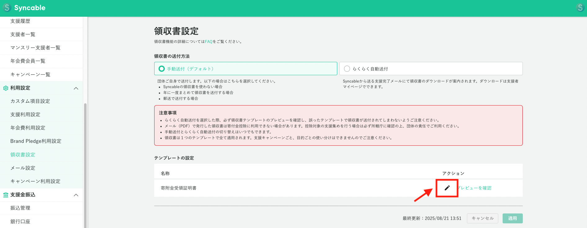 また、Syncableからダウンロードできる領収書をご利用の団体様は、団体管理画面「領収書設定」のテンプレートの編集も併せてご対応をお願いいたします。