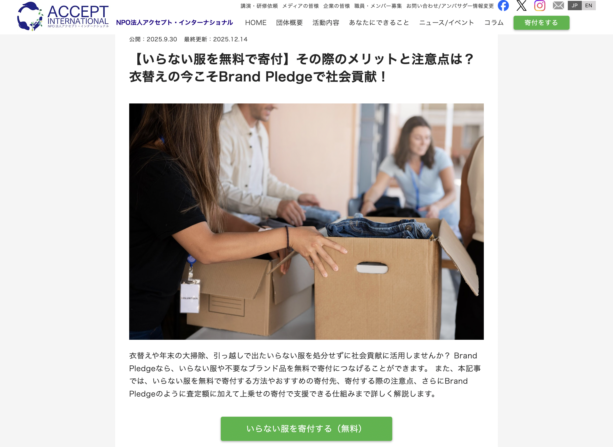 NPO法人アクセプト・インターナショナル:【いらない服を無料で寄付】その際のメリットと注意点は?衣替えの今こそBrand Pledgeで社会貢献!