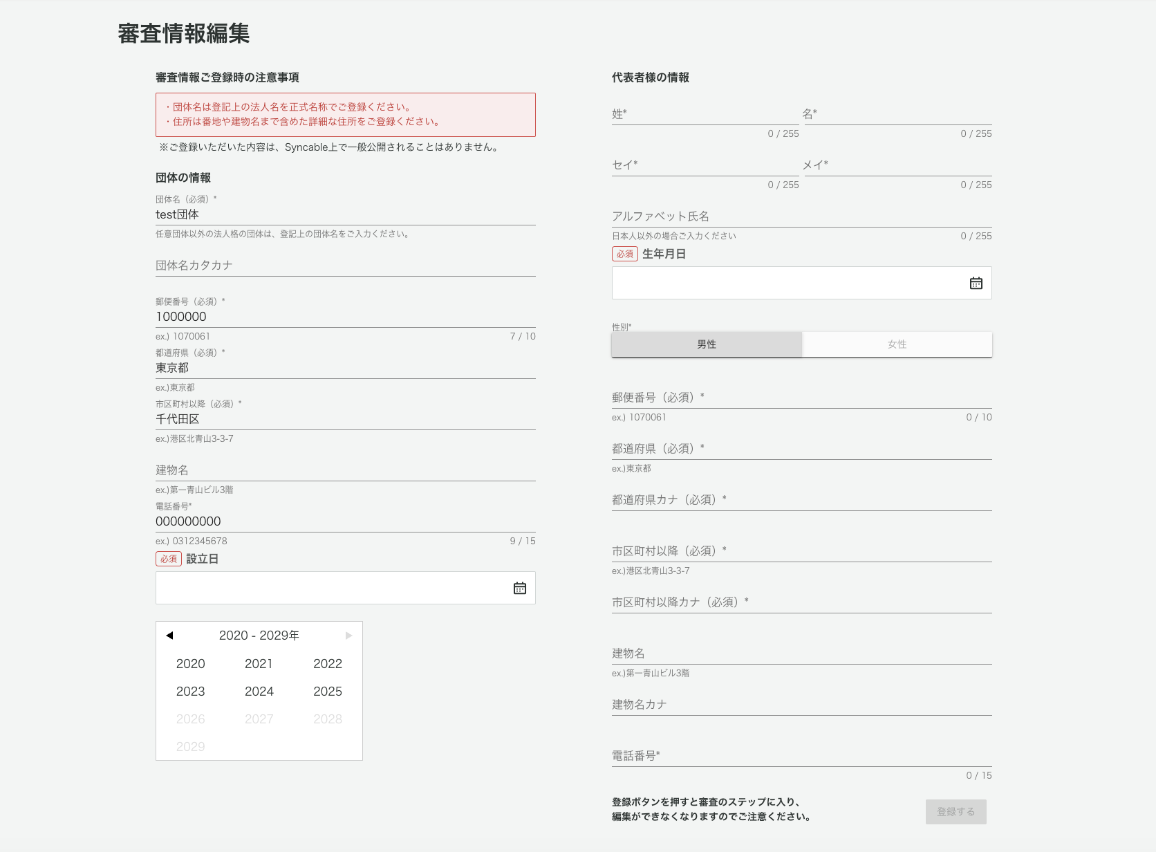 - 「審査情報を編集する」ボタンをクリックし、団体情報と代表者情報を入力してください。