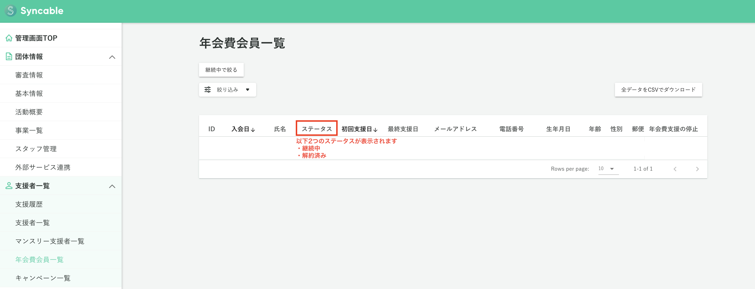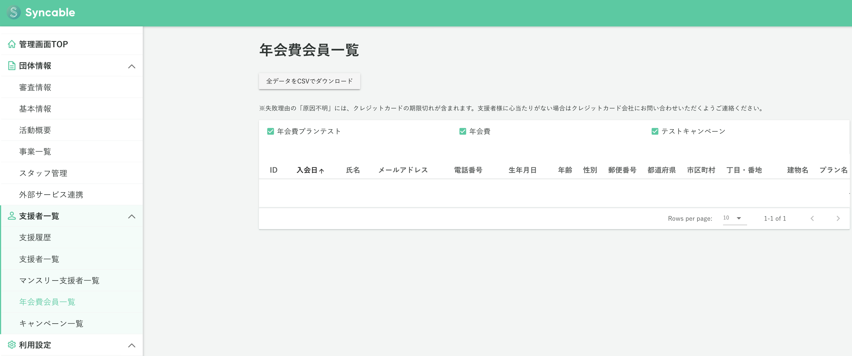 団体管理画面「年会費会員一覧」は、年会費会員の情報を確認できる画面です。