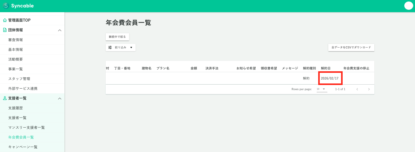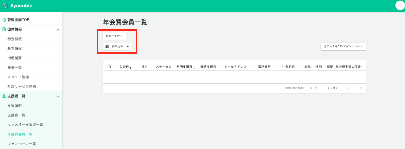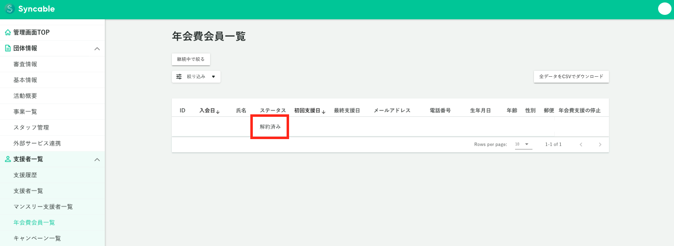 「継続中で絞る」をクリックすると、解約済みの年会費会員を除き、現在継続中の年会費会員のみを表示できます。