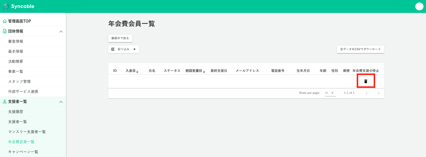 ②該当の年会費会員情報の「年会費支援の停止」欄からゴミ箱マークをクリックする