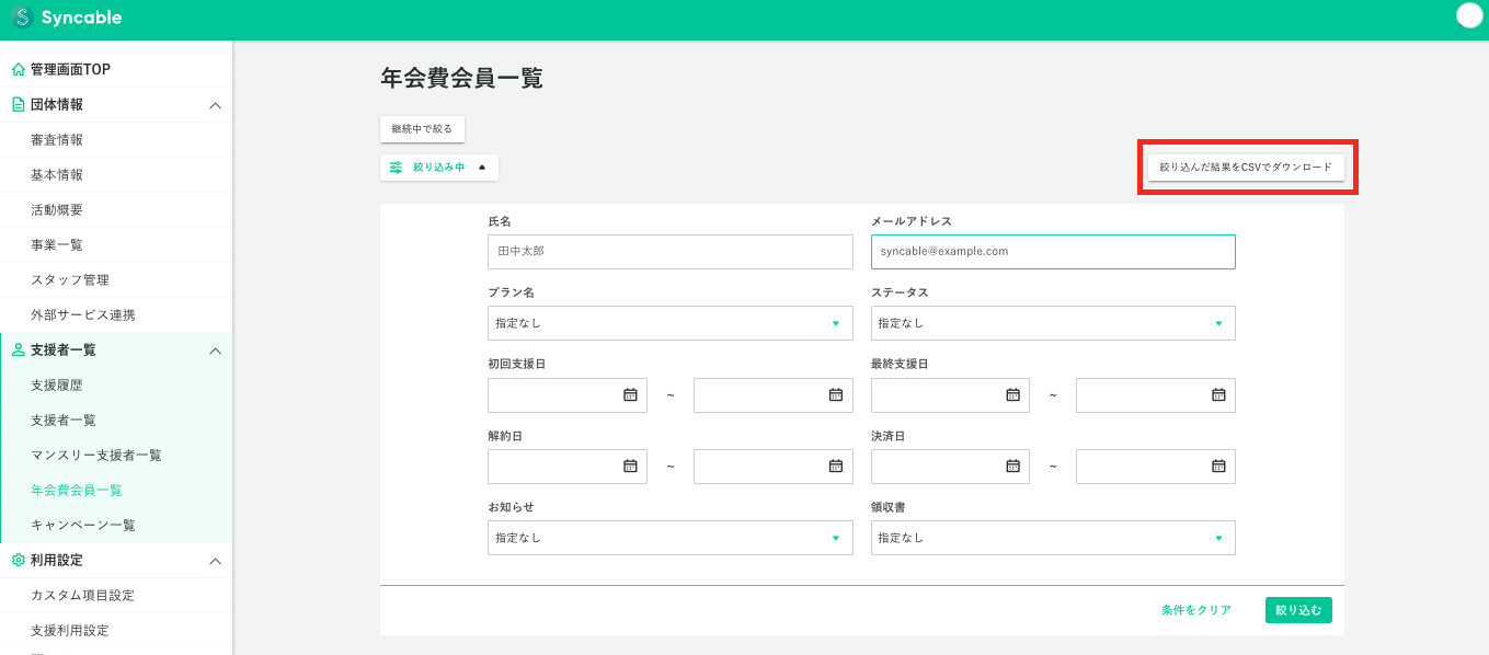 また、絞り込み結果はCSV形式でダウンロードすることも可能です。集計や管理業務にぜひご活用ください。
